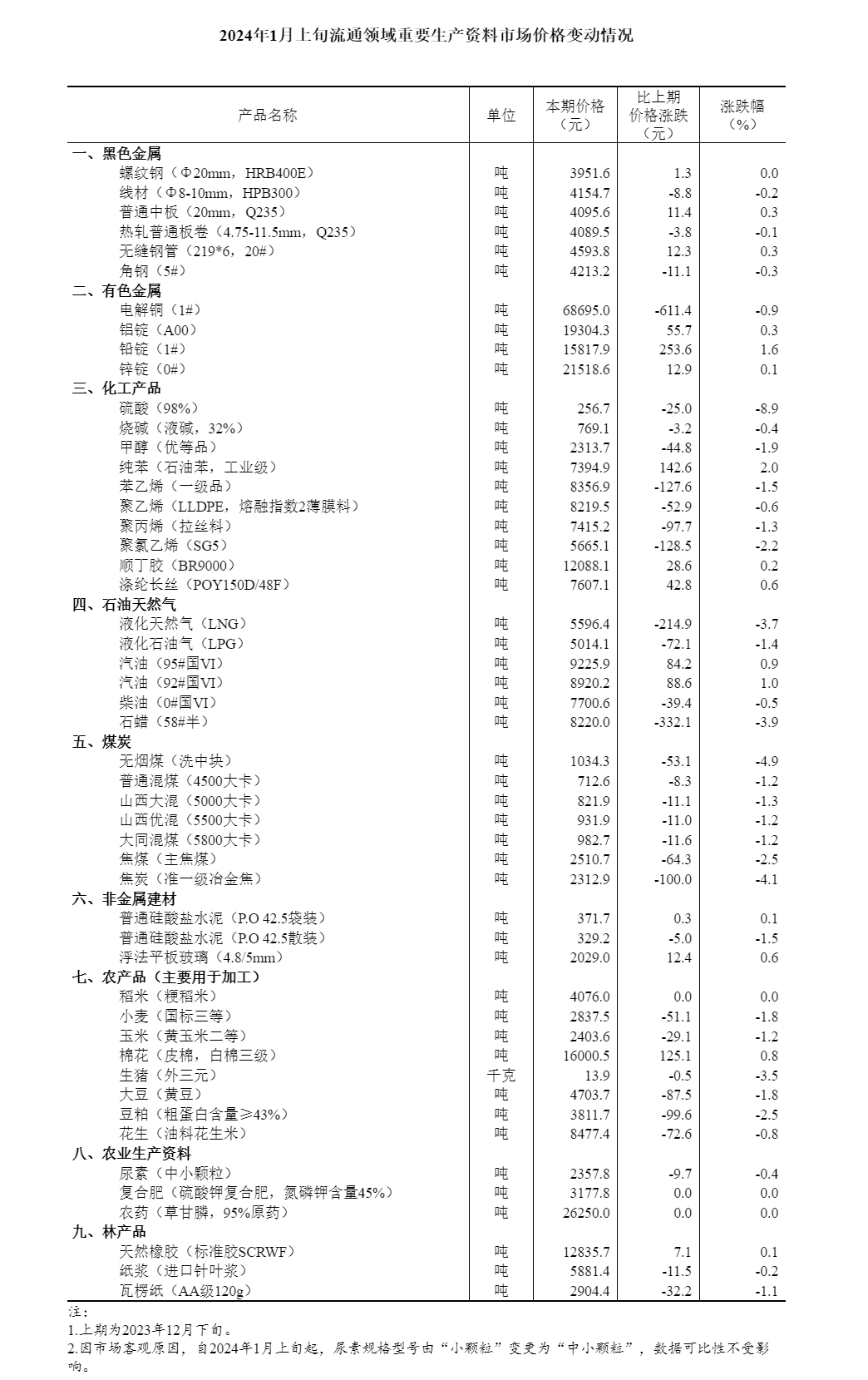 国家统计局:2024年1月上旬与2023年12月下旬相比 14种产品价格上涨 32种下降 4种持平