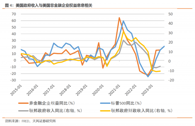 美国财政收入的规律性较强,和经济基本面挂钩。历史上,美股表现领先美国财政收入,2023年标普500涨幅为15.9%,对应2023财年美国的财政收入为4.748万亿美元。我们预计2024年美国财政收入较2023年上涨4%(和名义增速基本匹配),即上升1900亿美元至4.938万亿美元。