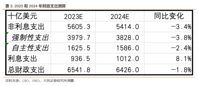 无论如何,由于非国防自主性支出对于总财政支出的影响不是绝对性的,2024年美国非利息财政支出大概率下降,如果没有达成“握手”协议,我们预计降幅为3.4%。