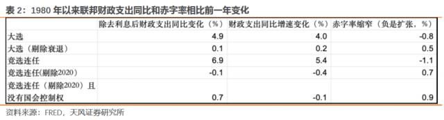 由于财政支出对经济和就业的积极影响有利于提高投票支持率,因此在任总统是否竞选连任对选举年的财政支出有一定影响。从历史数据来看,剔除掉受疫情影响的2020年,竞选连任年份的财政支出增速比前一年平均低0.1个百分点,剔除利息支出后的财政支出增速比前一年平均低0.4个百分点,赤字率则低0.7个百分点。