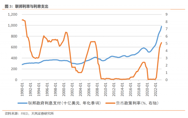 只要美债利率没有大幅回落,2024年债务利息支出还是会略微上升,我们预计将比2023年的利息支出高出754亿美元,至1.012万亿美元。